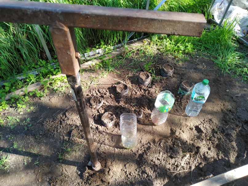 Bottle on the far right: deposit garbage, next to it on the left: Head cut off, hole for drainage of too much water at 2/3 height, even further left: Logo removed (so that neither theft is worthwhile and likewise no foil flies around as plastic garbage) - far left: Auger for the next bottle already set.