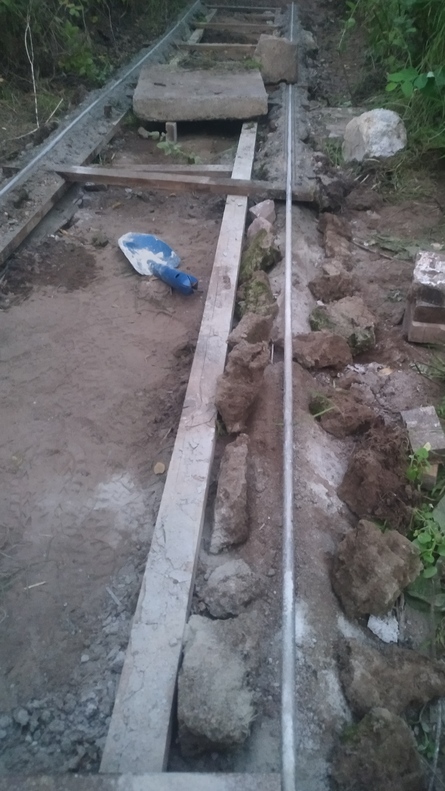 Rail best laid with template for constant spacing. You don't need much concrete, but potassium silicate to insulate against water is important against the frost in winter, so that the concrete does not crack due to expanding ice.