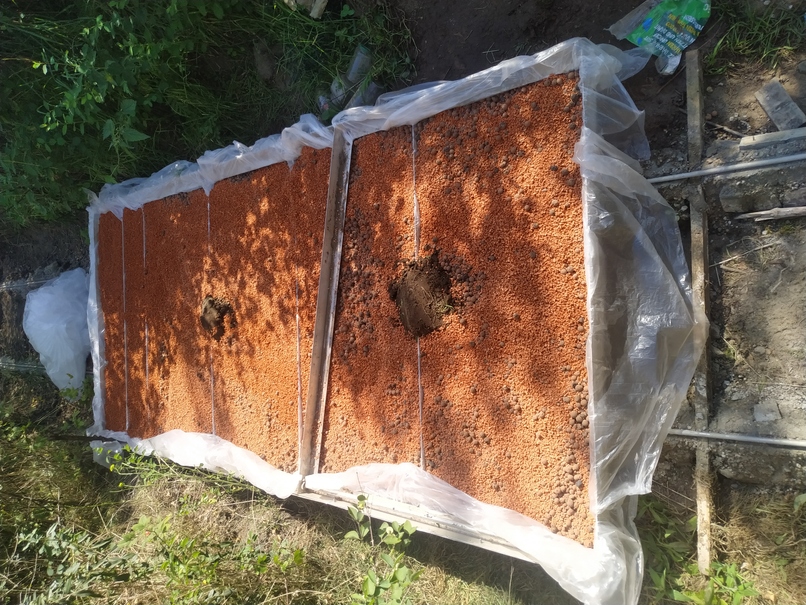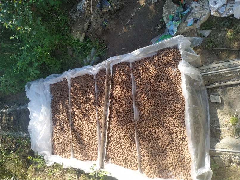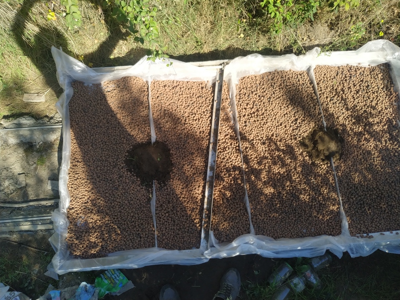In addition, I have placed fine clay crumbs as a layer between the expanded clay and the earth layer, so that the earth does not simply sag away under the lighter expanded clay.